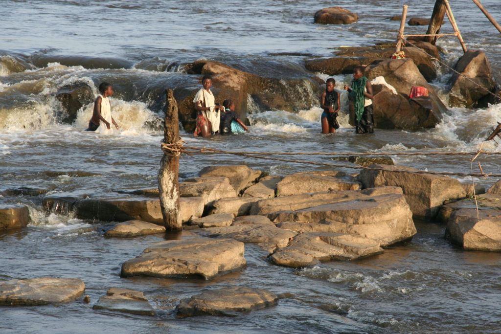 Am letzten Tag Ihrer Flussfahrt besuchen Sie in der Nähe von Kisangani die Wagenia Fälle, die eigentlich eine Serie von Stromschnellen sind und früher als Stanley Falls bekannt waren. Hier lebt das Volk der Wagenia Fischer, deren Kultur heute vom Untergang bedroht ist. Seit mehr als 200 Jahren praktiziert dieser Stamm eine besondere Art des Fischfangs. Über die Stromschnellen wurden Bambusgerüste gebaut, an denen große Korbgeflechte als Netze ins Wasser gehängt werden. Diese Körbe haben eine große Öffnung, aber ein schmales langes Ende, damit ein Fisch, der von der Strömung hineingetrieben wird, nicht wieder herausgelangen kann. Der Häuptling bestimmt dabei, welche Familie an welcher Stelle ihr Korbnetz in die Stromschnellen hängen darf. Es gilt: je ertragreicher der Fanggrund, desto höher der Status der Familie.