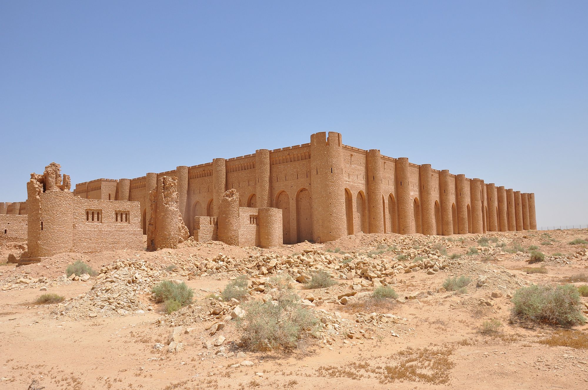 Danach weiterfahrt nach Ukhaider, einer Palast-Festung der Umayyaden-Kalifen und wichtiger Stopp auf den regionalen Handelsrouten. Die Festung spiegelt den in Nomadenlagern üblichen Aufbau wider mit einem großen Ehrenhof mit Audienzsaal in der Mitte, Privatgemächern des Herrschers am Kopf und an den Seiten die „Häuser“ seines Gefolges. Im Jahre 1909 durch die berühmte britische Historikerin und Archäologin Gertrude Bell entdeckt, beeindruckt die monumentale, ca. 17 m hohe Fassade mit ihren vielen Türmen und Doppelbögen noch heute. Diese Bögen werden als Vorläufer und Beispielgeber der europäischen gotischen Bogenarchitektur gesehen.