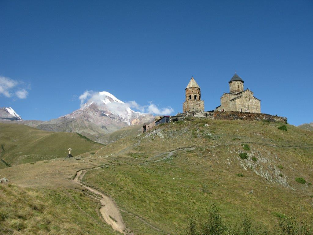 Von Puschkin in einem Gedicht besungen, liegt auf 2.200m Höhe auf einem Vorberg des Kasbek die Kuppelkirche Zminda Sameba (Dreifaltigkeitskirche). Die Anlage wurde im 14. Jh. erbaut und ist bis heute ein Wallfahrtsort.