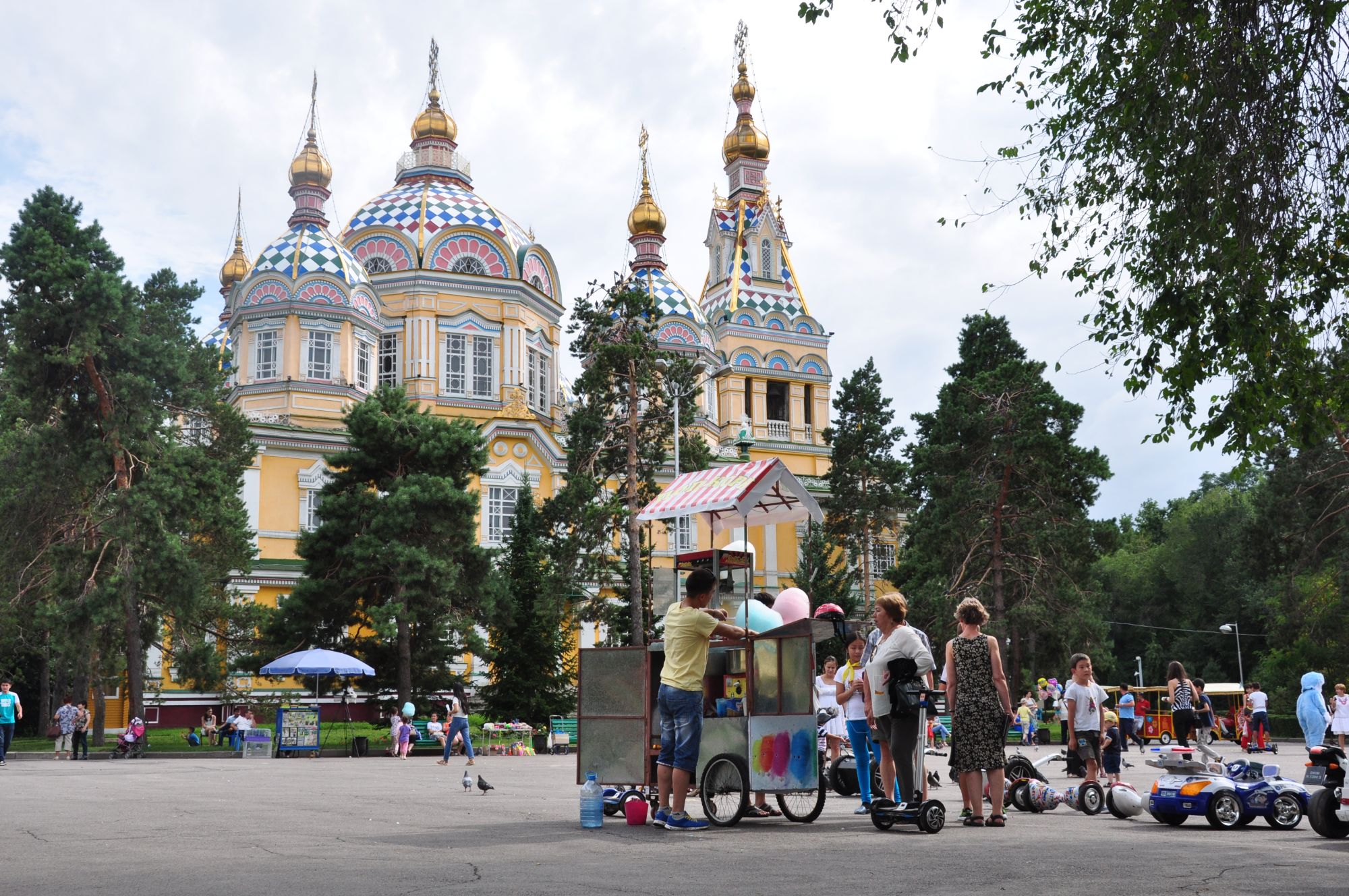 Anreise am Vortag in Eigenregie, Ankunft am Morgen in Almaty und Transfer zum Hotel, anschließend Ruhepause. Nach der Ruhepause beginnen Sie mir Ihren Erkundungen in Almaty, der mit knapp 2 Millionen Einwohnern größten Stadt Kasachstans. Sie besichtigen zuerst den ca. 18 Hektar großen Panfilov-Park. Die ewige Flamme, die nie erlischt, erinnert hier an die zahllosen Opfer des zweiten Weltkrieges. In der Mitte des Parks befindet sich das 1907 fertiggestellte histroische Wahrzeichen der Stadt, die Christi-Himmelfahrt-Kathedrale.