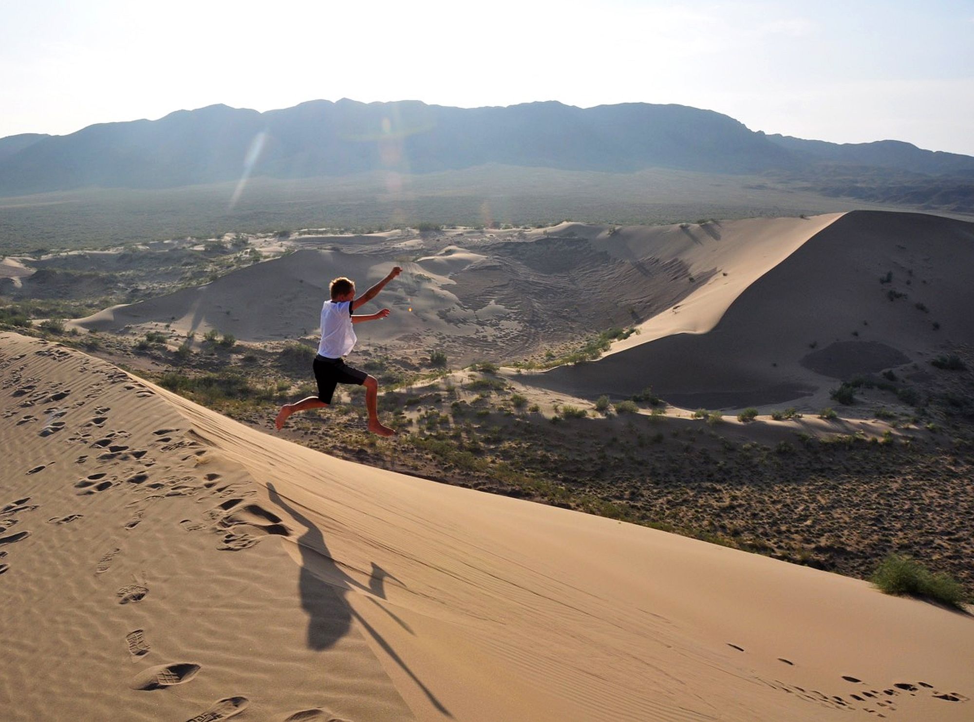 Heute erklimmen Sie die 180 Meter hohen, halbmondförmigen Sanddünen, die im Wind „singen“. Wenn man auf dem Kamm läuft und sich der östlichen Seite nach unten rutschen lässt, kann man aus der Tiefe ein Summen und Dröhnen hören, das an eine monoton spielende Orgel gleicht.