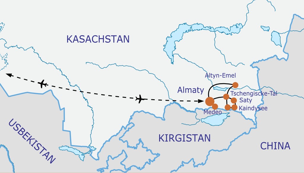 - Internationale Flugverbindungen (Deutschland – Almaty – Deutschland ) auf Anfrage. Gerne machen wir Ihnen hierzu ein tagesaktuelles Angebot.