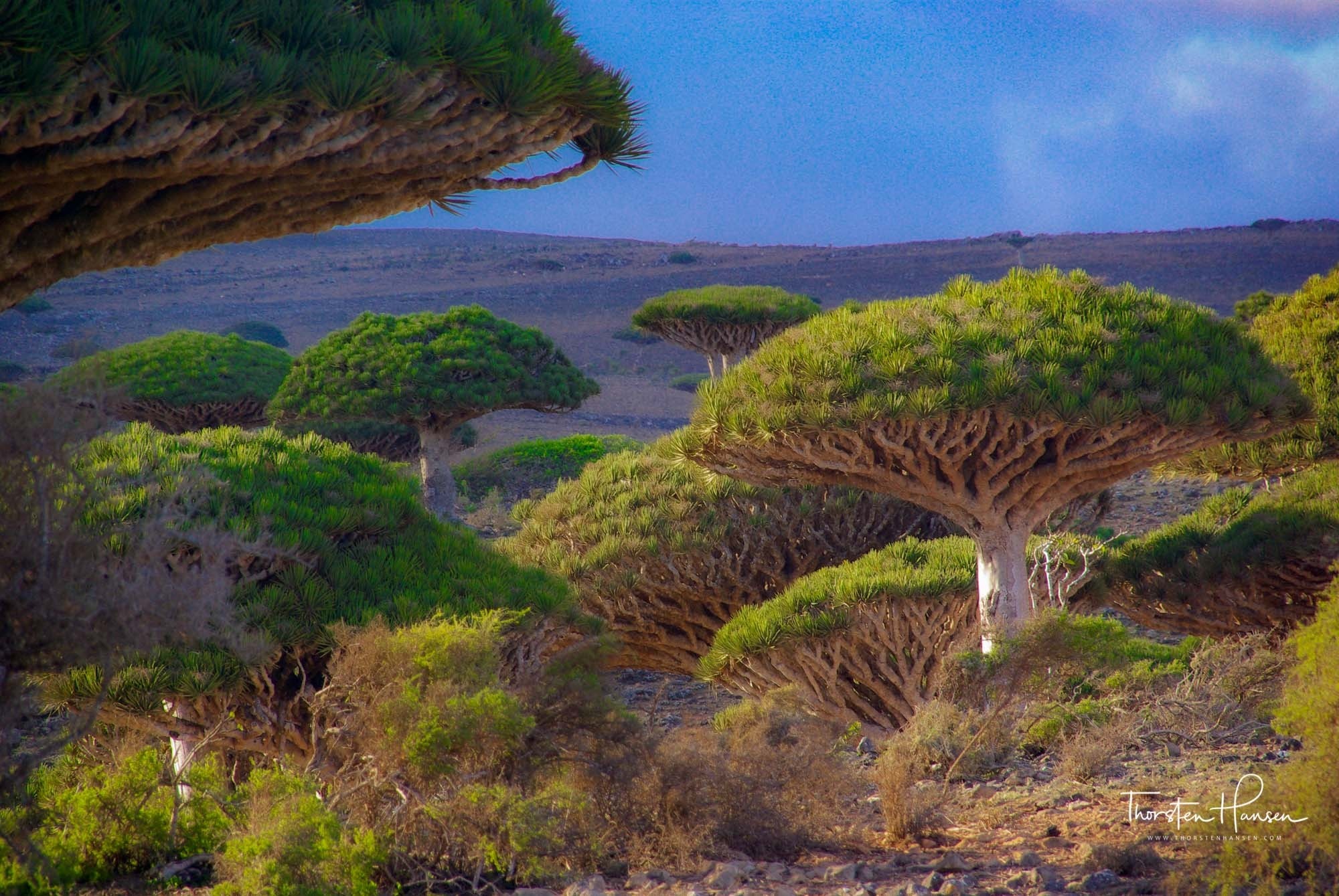 Kennen Sie die Ikone der Insel Sokotra? Der Drachenblutbaum, mehr noch, ein ganzer Wald von Drachenblutbäumen schmückt die Insel am Diksam-Plateau. Vor mehr als 20 Millionen Jahren trennte sich der Sokotra-Archipel von der Arabischen Halbinsel und liegt seither im Indischen Ozean etwa 400 Kilometer südlich des Jemen, zu dessen Staatsgebiet er gehört.