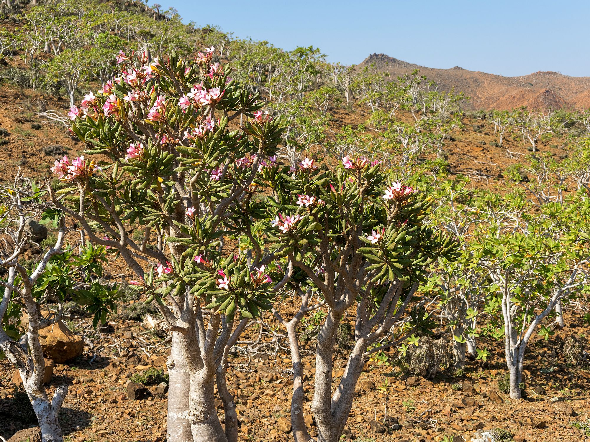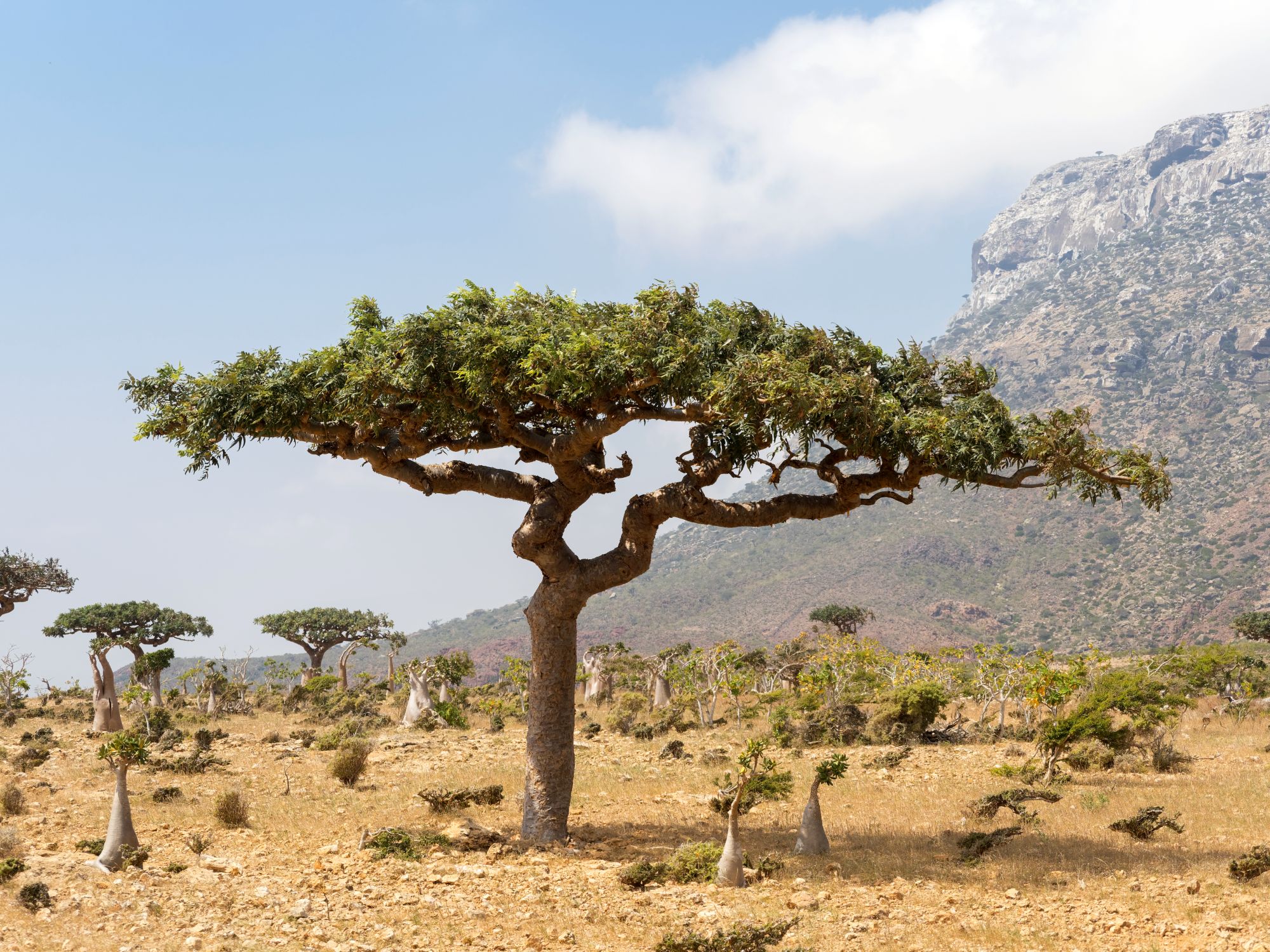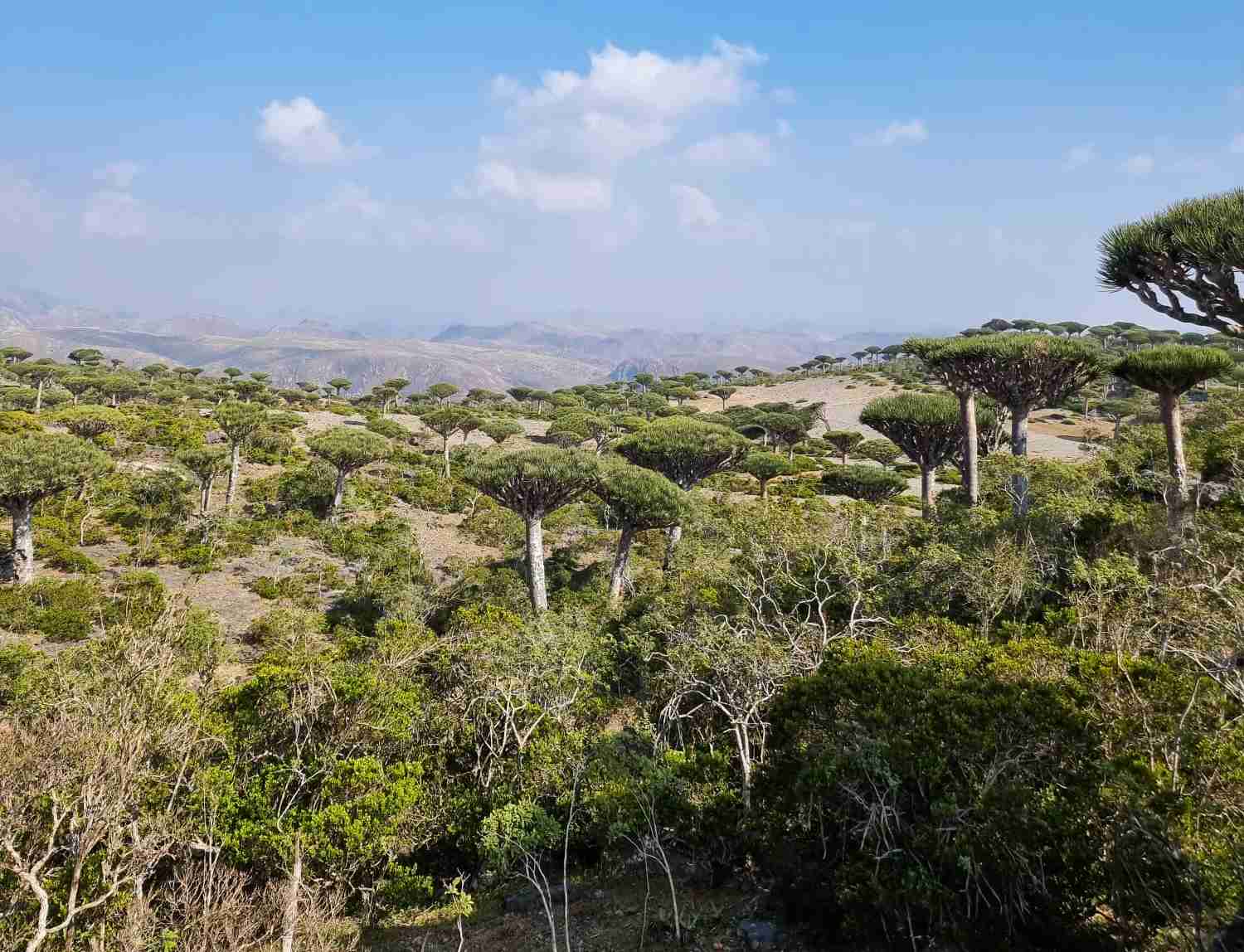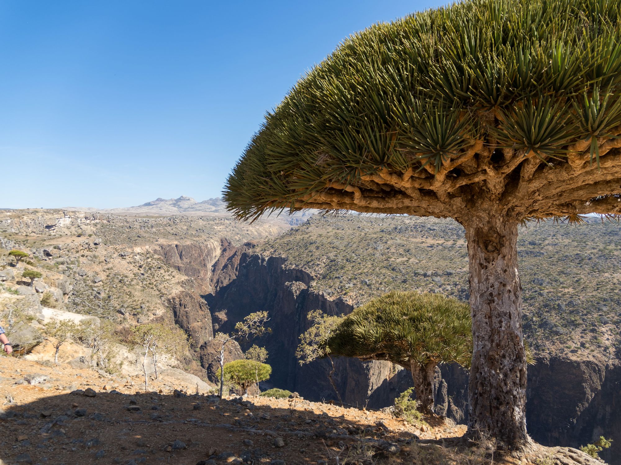 Danach geht es weiter zum Diksam-Plateau, ca. 700 m. über dem Meeresspiegel gelegen, und dem Panorama-Aussichtspunkt von Shebahon. Diese Gegend beheimatet viele endemische Pflanzenarten, doch vor allem der Drachenblutbaum-Park macht sie zu einem einzigartigen Erlebnis für Naturliebhaber.