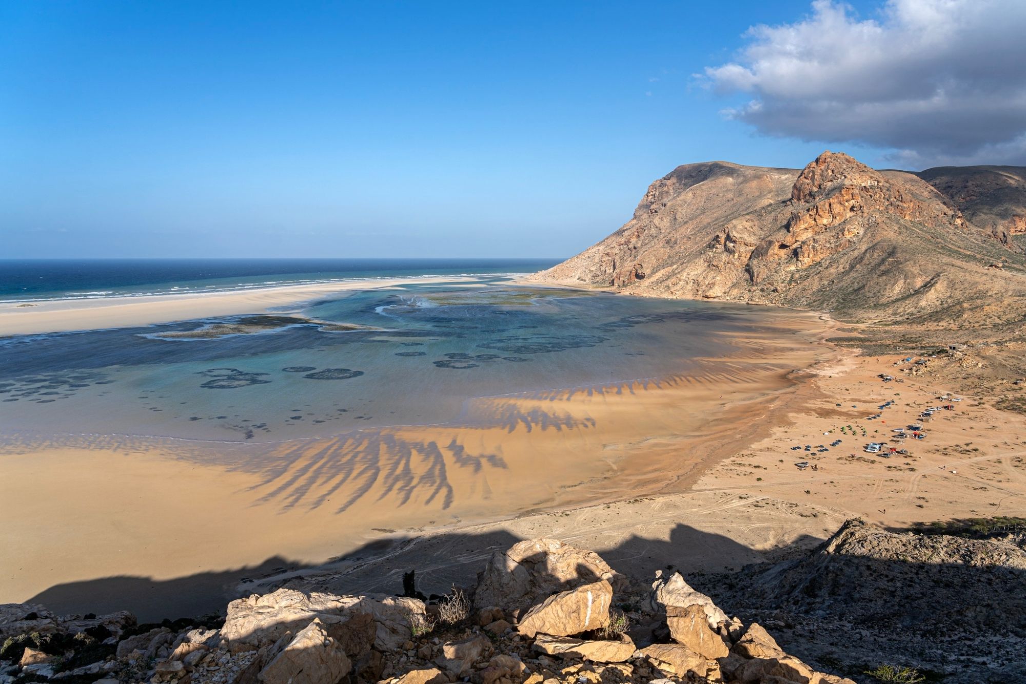 Nach einer Nacht im Zelt am Strand und einem frühen Frühstück fahren Sie nach Ras Arsel, dem östlichsten Punkt von Sokrota, von dem aus man einen guten Blick auf das Zusammentreffen von Arabischem Meer und Indischem Ozean hat.