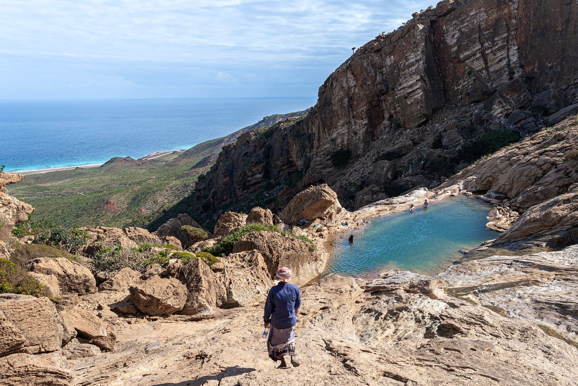 Nach einer kurzen morgendlichen Abkühlung im kristallklaren Wasser des Indischen Ozeans fahren Sie zur Dagub-Höhle. Von dort können Sie weit ins Land blicken und einige traditionelle Dörfer der Sokotris am Horizont sehen. Die Tropfsteinhöhle selbst ist einzigartig, da es viele Stalaktiten, Stalagmiten und kleine Wasserbecken gibt, die hier im Laufe der Jahrtausende entstanden sind.