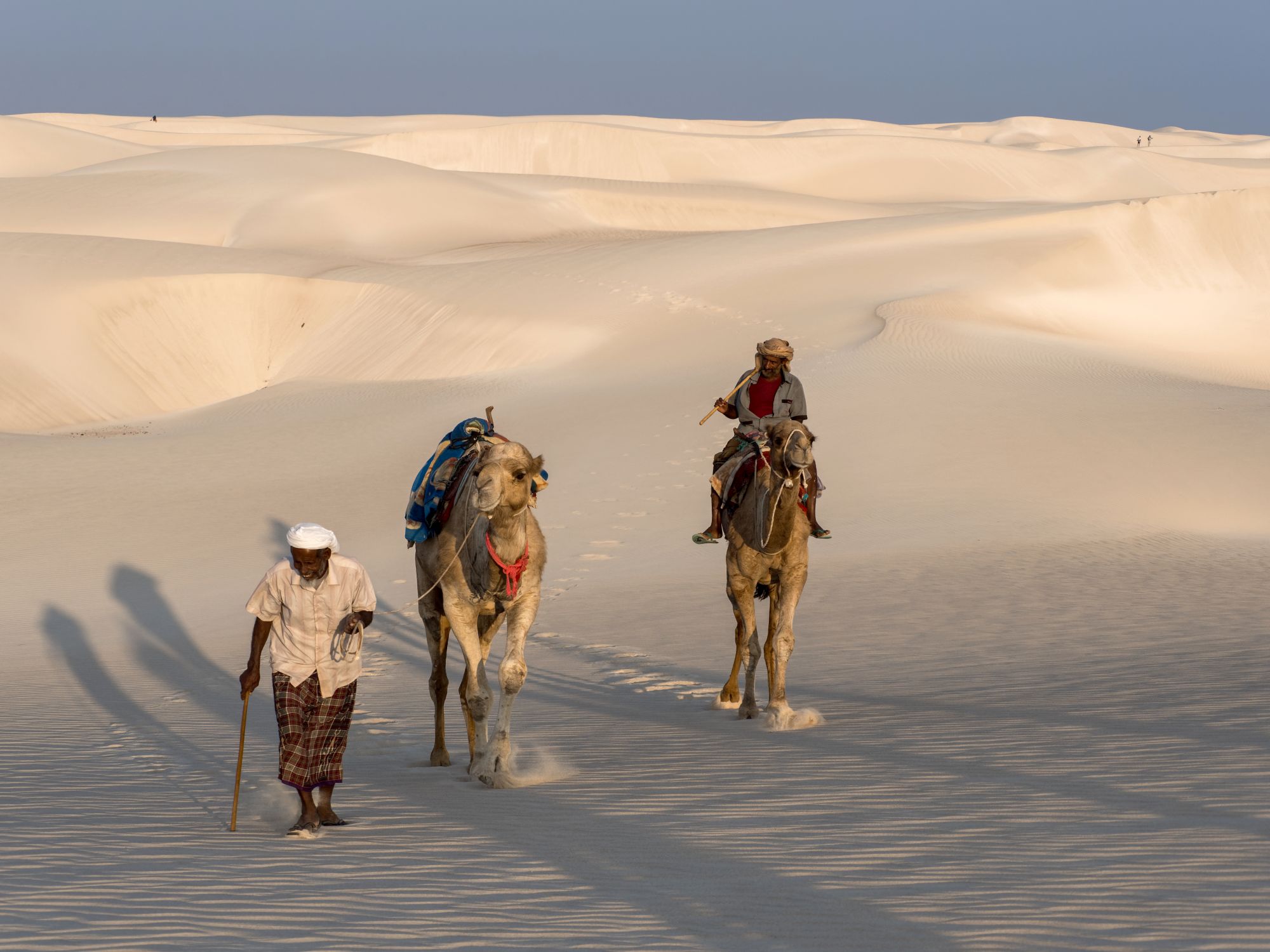 Kurzes Picknick und anschließend Geländewgenfahrt bergab durch die Täler bis hinunter zur Küste. Dort erreichen Sie die Sanddünen von Zahek. Die weißen Dünen, die heute das Landschaftsbild prägen, entstanden durch saisonale Winde, die riesige Sandmassen aus dem Meer direkt an die Felsen wehten. Ein wunderbarer Ort für lange Spaziergänge, Sandboarding oder einen Kamelritt am Strand. Abendessen und Zeltübernachtung am Strand im Camp Aomak.