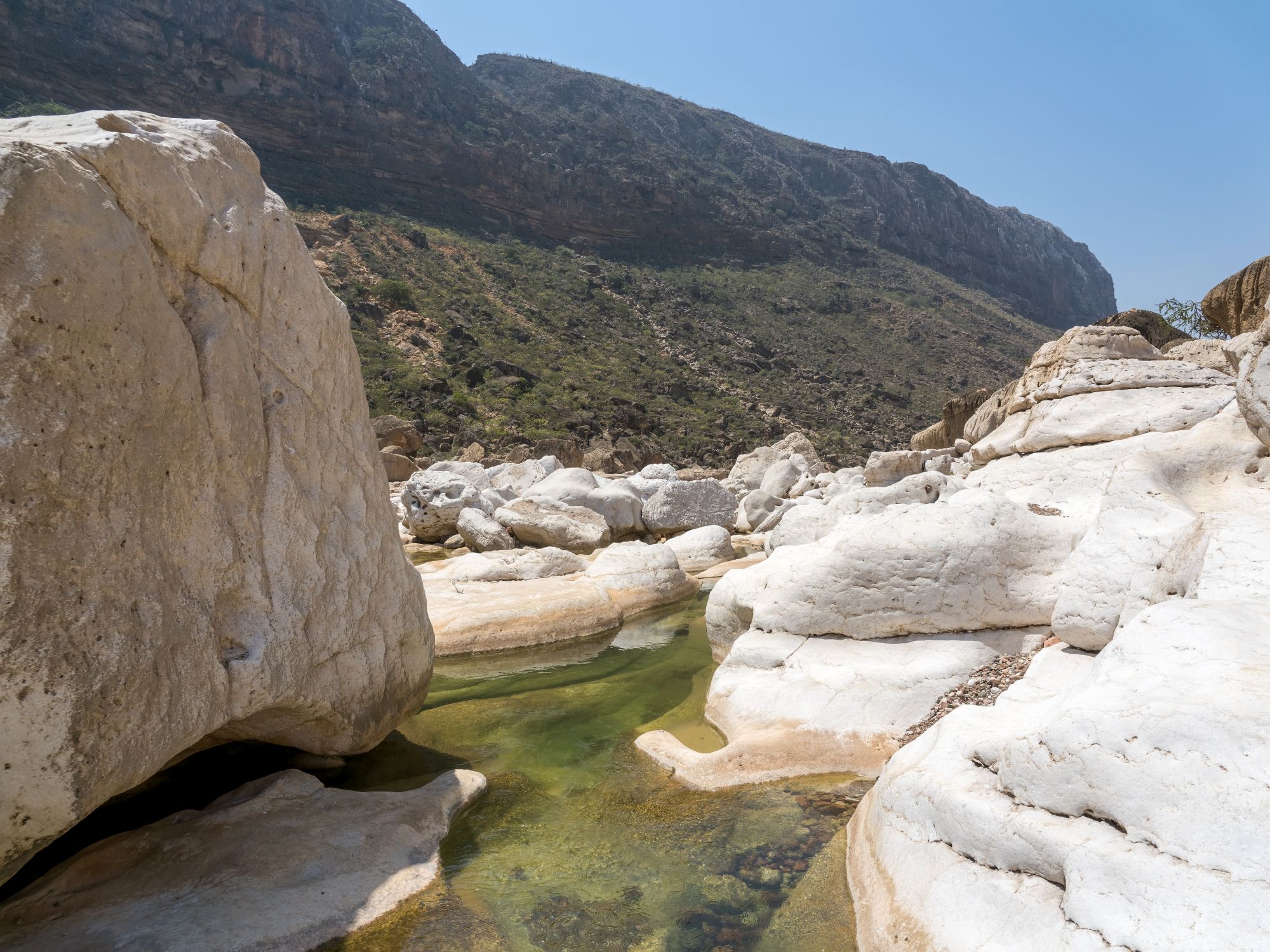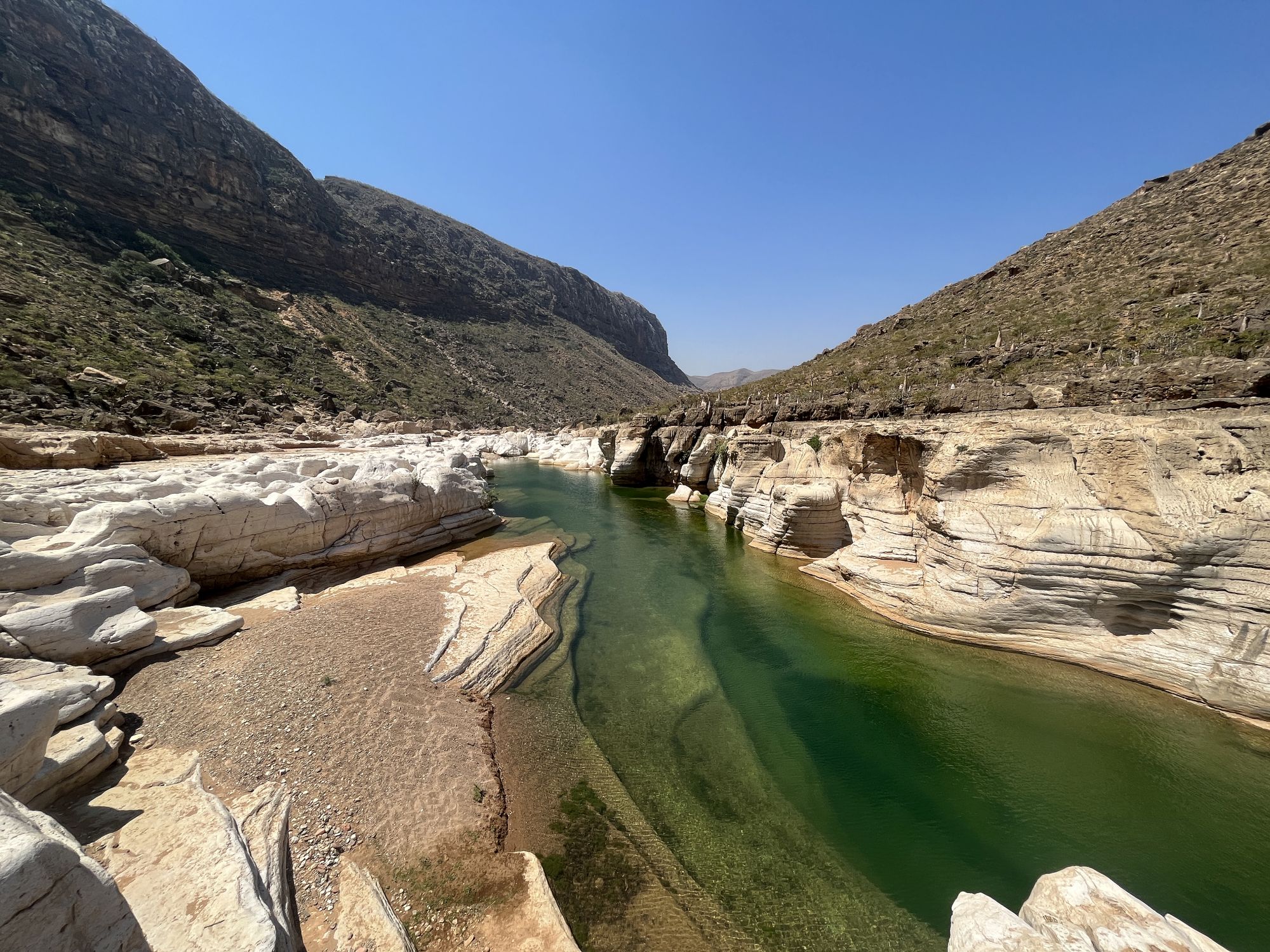 Sie fahren in das Naturparadies Homhil, das berühmt für seine endemische Pflanzenwelt ist: darunter Drachenblut-, Weihrauch- und Aloebäume, die farbenfroh zwischen dem grauen Kalkstein der Insel und den leuchtenden Türkistönen des Arabischen Meeres herausragen.