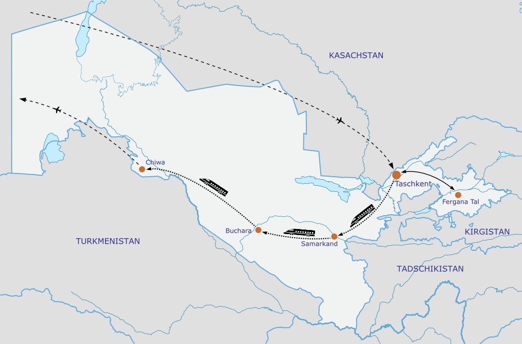 Usbekistan öffnet sich der Welt. Der Schienenausbau und die Modernisierung der Bahnen wird aktuell kontinuierlich vorangetrieben und der Hochgeschwindigkeitszug Afrosiab ist ein Beleg für die Fortschritte bei der Verbesserung der Bahn-Infrastruktur. Ihre Zugreise startet in der Hauptstadt Taschkent. Sie reisen mit verschiedenen Zügen entlang der berühmten Städte Samarkand, Buchara bis nach Chiwa und von dort per Nachtzug durch die Wüste zurück in die Hauptstadt.