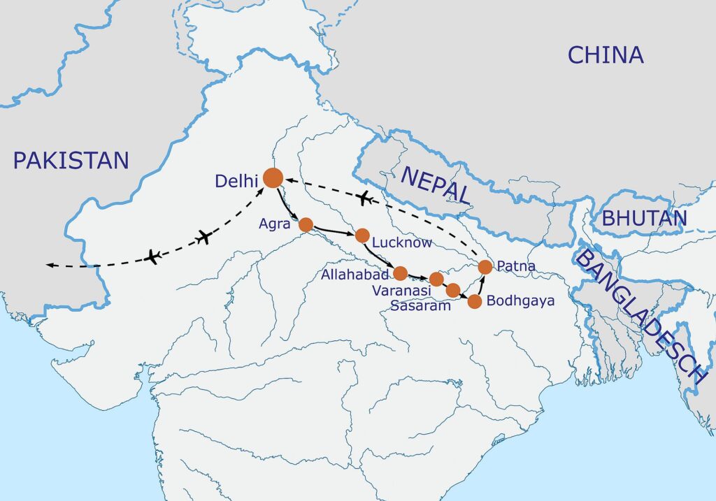 Am Nachmittag Transfer zum Flughafen und nationaler Flug von Patna nach Delhi.