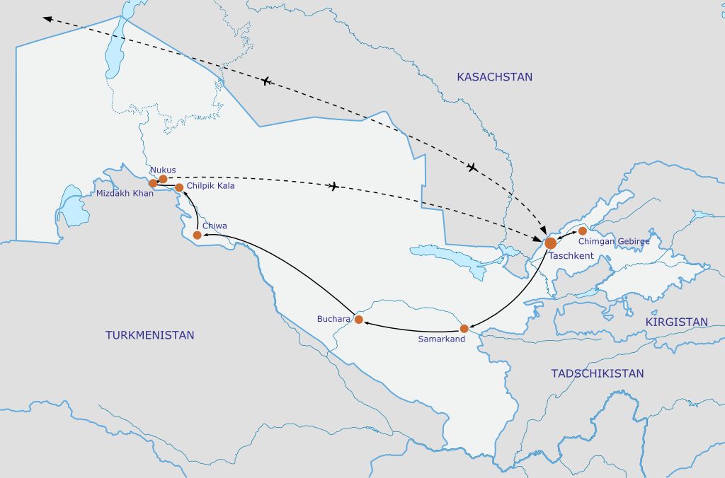 - Linienflug mit Uzbekistan Airways oder Turkish Airlines nach Taschkent und zurück inkl. Steuern und Gebühren (gerne machen wir Ihnen hierzu ein tagesaktuelles Angebot)