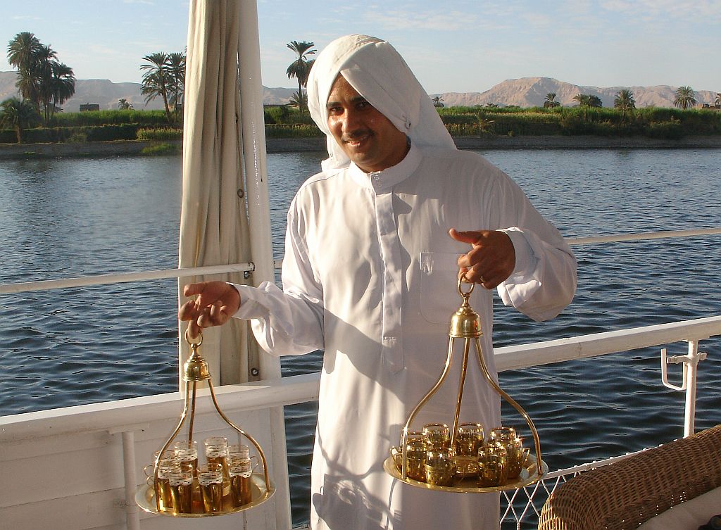 Der leichte Nordwind bläht die Segel. Die Dahabeya macht gemächlich Fahrt stromaufwärts. Der Kapitän und seine Crew gönnen sich auf der Bordwand des Vorschiffs im Schatten von rund 360 qm Tuch des dreieckigen Hauptsegels eine Teepause.