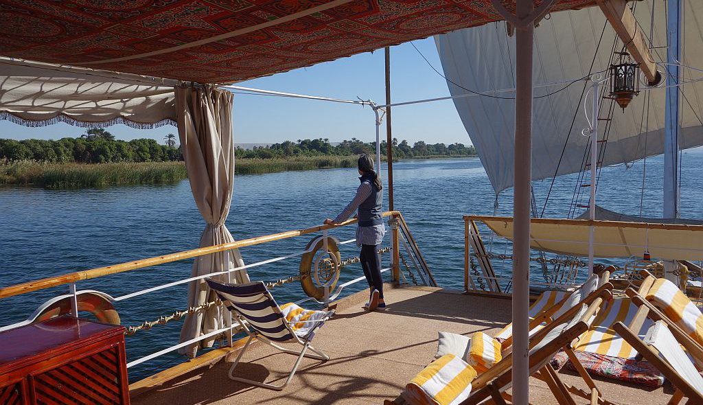 Nur das leichte Schlagen der Segel im Wind und das Knarren der hölzernen Deckplanken durchdringen die Stille. Ab und zu ruft ein Esel vom Ufer her. Vögel zwitschern und flattern herum.
